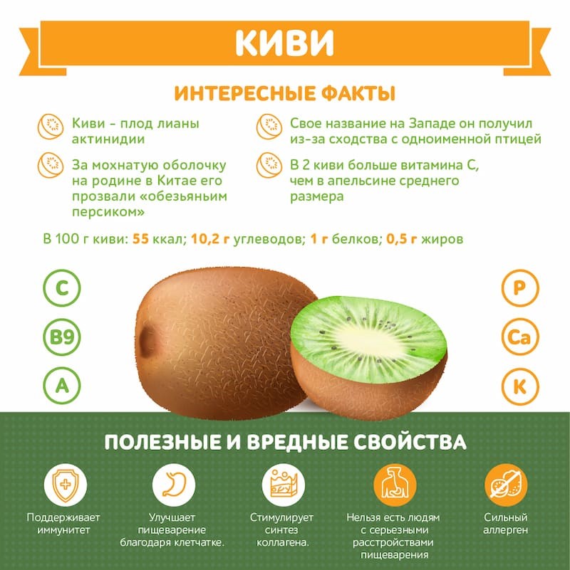 Однако имеются и противопоказания: киви — сильный аллерген. Людям с расстройствами пищеварения от продукта тоже нужно отказаться. Также киви может вызывать раздражение слизистой рта — фермент актинидин и органические кислоты в киви могут вызывать у чувствительных детей ощущение жжения, покалывания или лёгкого отёка во рту и на губах.